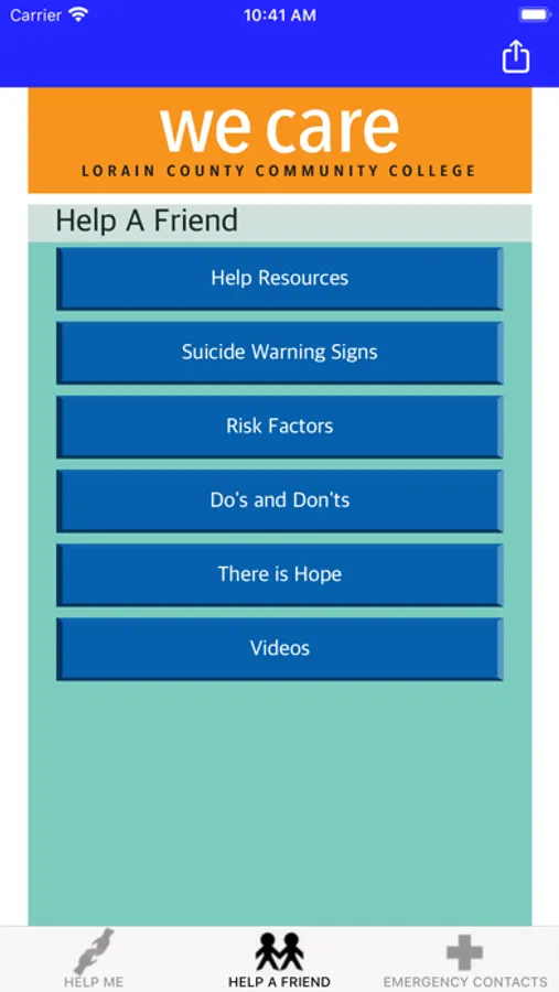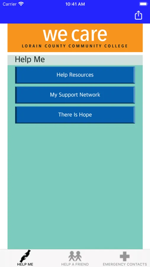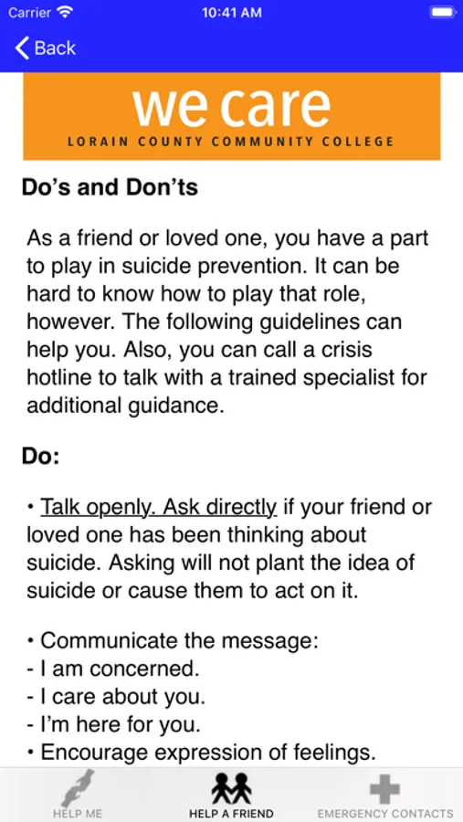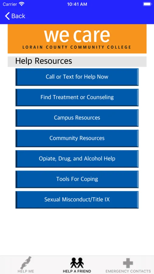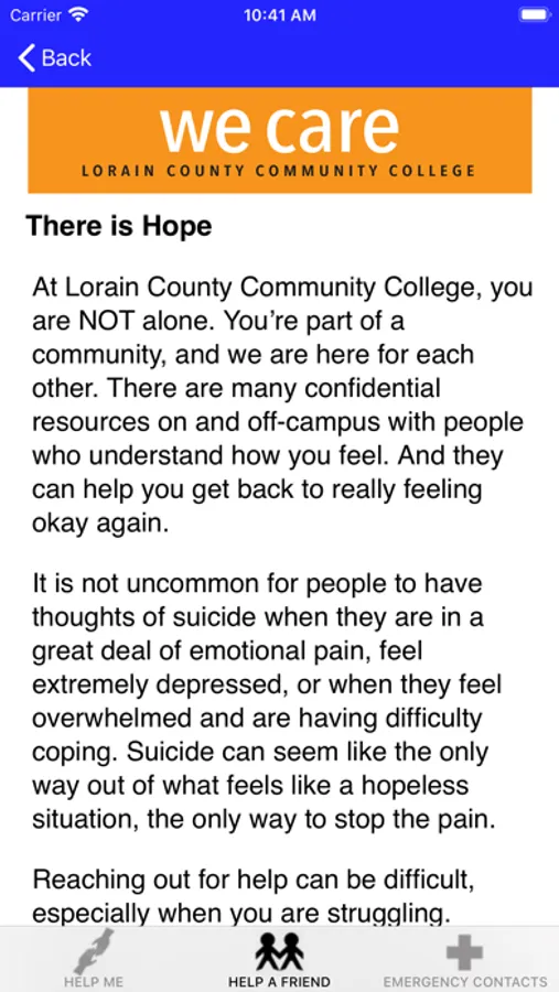 Lorain County Community College's We Care app provides quick access to guidance for supporting a friend in need, suicide prevention, or coping with mental health challenges. It also supplies information about resources and services offered on the campus and in the community, including crisis hotline numbers. The We Care app is designed for students, parents, friends of students, faculty and staff of Lorain County Community College, located in Elyria, Ohio. The We Care app better prepares people to help a friend, loved one or themselves.