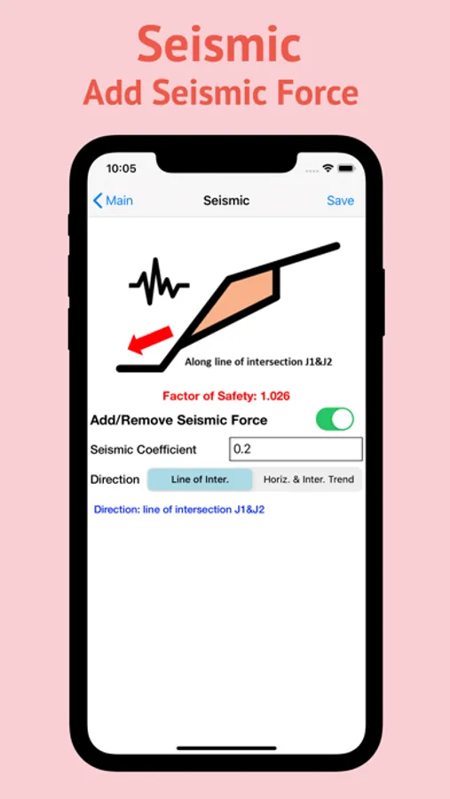 - Seismic Force can be applied to the wedge by selecting the Seismic switch box. If Seismic Force has been applied to a model, the direction and existence of a seismic force will be represented on the 3D model as a yellow arrow at the lowermost wedge vertex on the slope face.