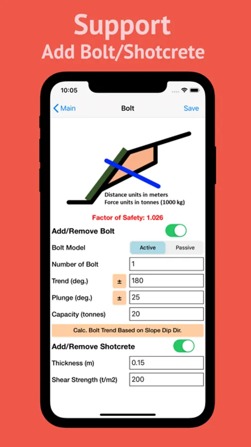 - Rock bolts and shotcrete can be applied to increase the wedge safety factor. The support parameters dialog allows user to easily add support and define the support properties for the model. Bolt’s trend angle will be calculated automatically based on the slope direction. User also will be able to modify the parameters. Shotcrete is only applied to the slope face of the model (not the upper slope). Slope face will be shaded gray, to indicate the presence of shotcrete.