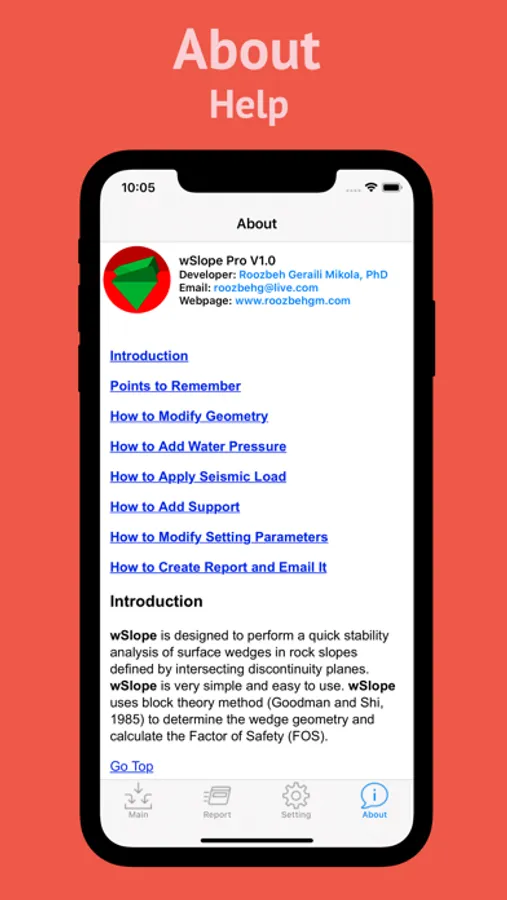wSlope is designed to perform a quick rock slope analysis on your phone device. wSlope is very simple and easy to use. wSlope uses block theory (Goodman and Shi, 1985) method to estimate the stability of surface wedges in rock slopes. wSlope has the following features: