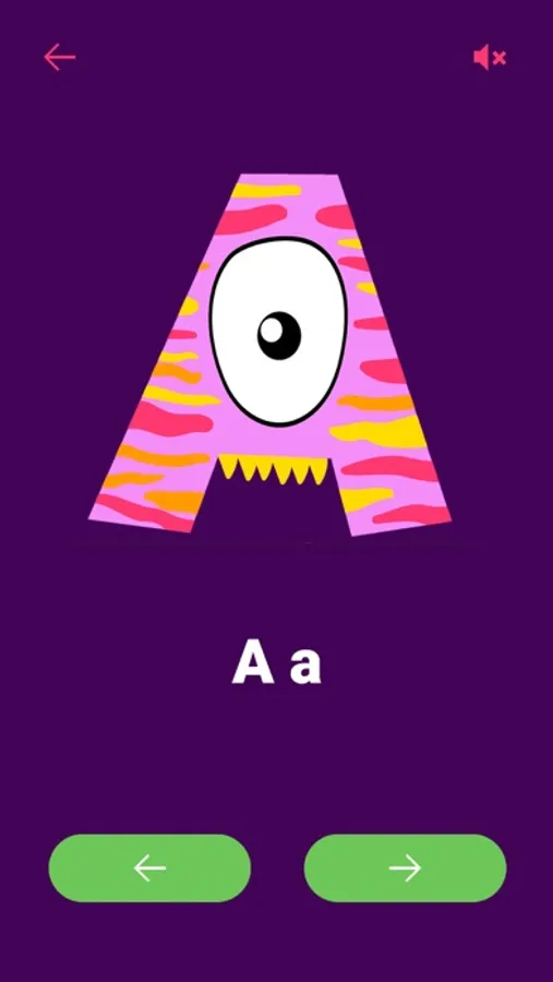 In this mode, children or adults can scroll through the letters in order in both directions. Each letter is voiced and pronounced. When looking at funny monsters, it will be easier for the child to remember the letters.