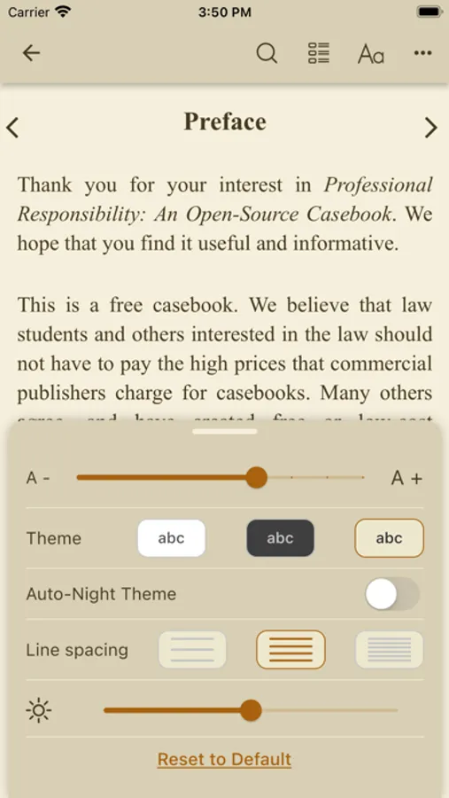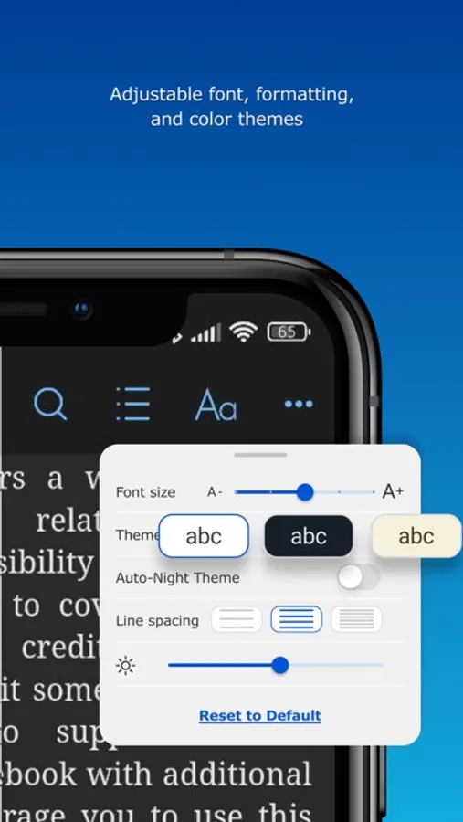 ∙ Personalize font size, color theme, line spacing, and more for more comfortable reading.