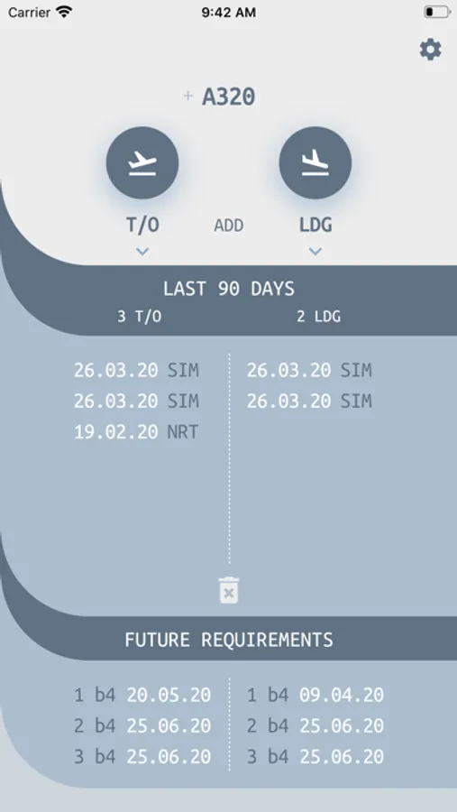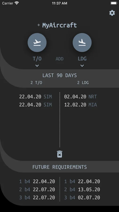 In aviation, to be allowed to legally operate an aircraft in commercial air transport or carrying passengers, you need 3 takeoffs and 3 landings in the preceding 90 days on that aircraft type. By entering the dates of your takeoffs and landings, this app gives you an easy to interpret preview of when your next ones are due.