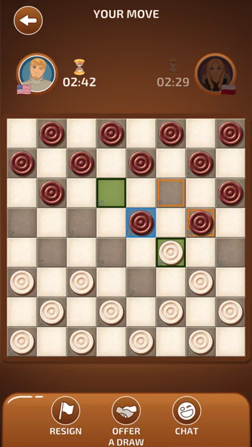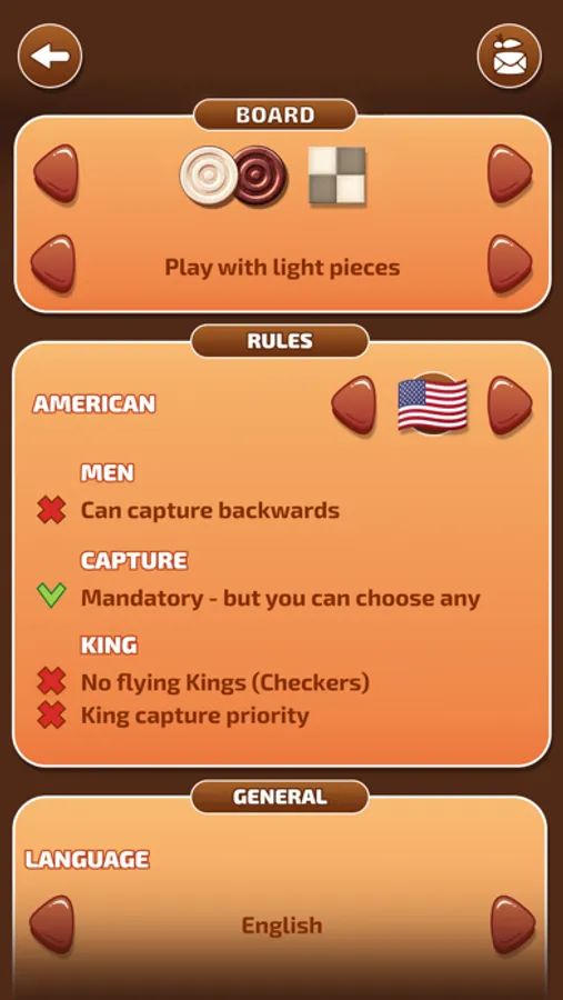 You can change game settings and choose your own Checkers app rules, e.g., to capture backward or to choose mandatory capture.