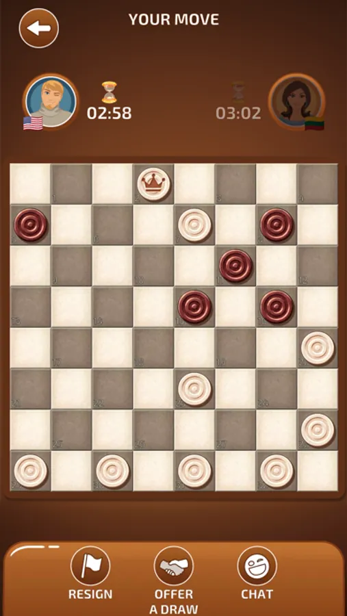 Play checkers online, offline with friends, or face 5 levels of the game against the computer.