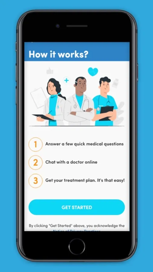 To see a doctor user needs to fill out a short intake form. Once your intake form is completed you go into a live virtual waiting room to video chat with a licensed doctor. Once finished with your visit you will be able to confirm the prescriptions or products your doctor recommends for you and pay.