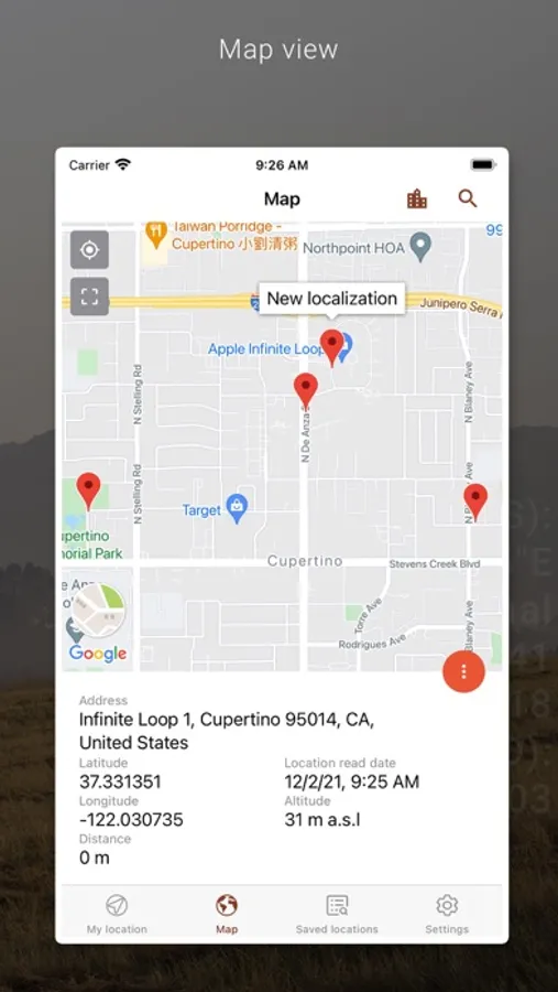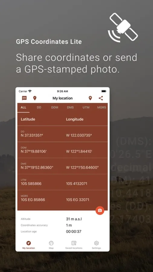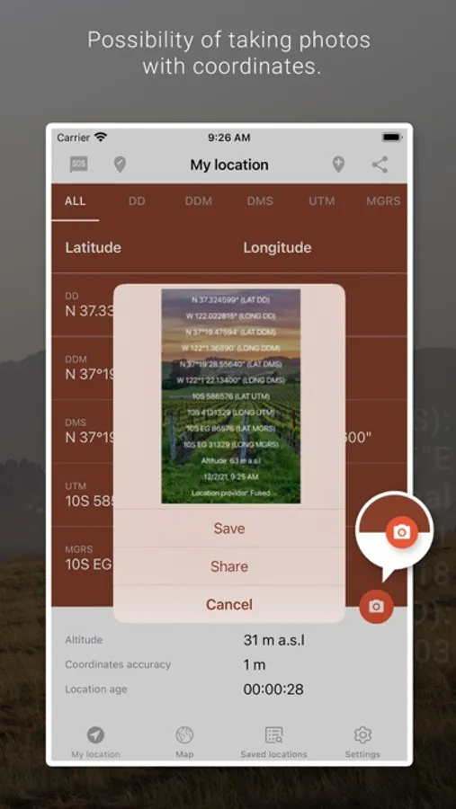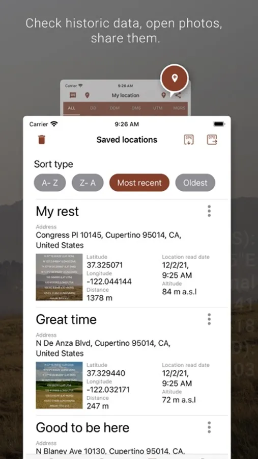 One of the most useful features is being able to take a photo with GPS coordinates overlayed on it. If you don’t want to take a picture, you can save your location by adding it to your places. In saved locations, you can find saved photos as well as saved places. Data history is recorded chronologically.