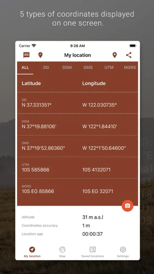 This application allows you to read geographical coordinates in four formats simultaneously. We are able to display coordinates in four formats on one screen: