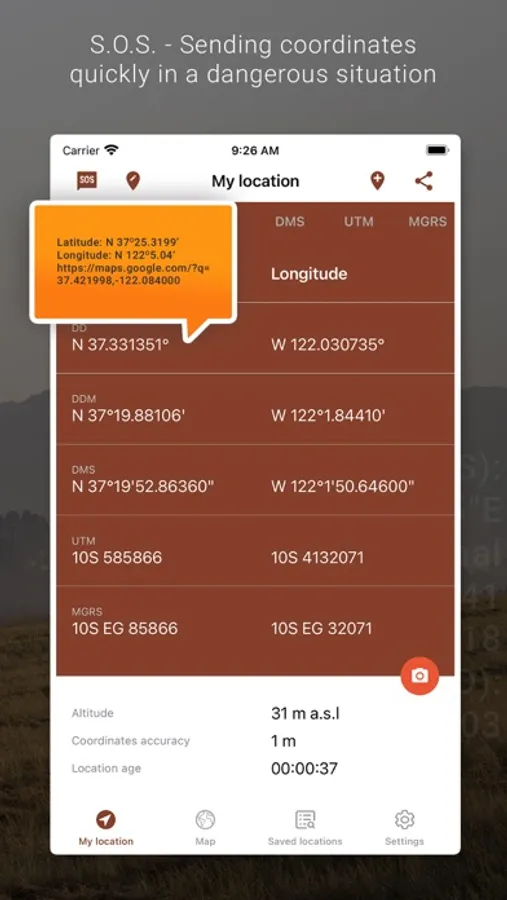 The S.O.S functionality allows you to quickly send your GPS coordinates and a Google Maps link by Messages to provided phone number(s) in settings. We can additionally provide text content that will appear in a message.