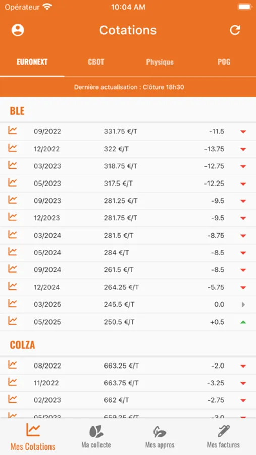 Cette application vous permet de consulter les cours Euronext en différé de 15 minutes, d’accéder aux dernières options traitées la veille, de consulter une note de marché hebdomadaire où vous y retrouverez l’essentiel du marché Euronext, Français, britannique et Mer Noire et enfin de consulter les cours physiques.