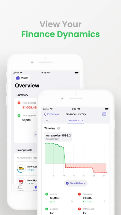 Intuitive chart and table for the summary of your finance over tracked periods.