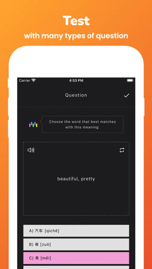 -Support many types of test for learning Chinese (Multiple choice question, listening, matching, flipping flashcard and etc.)
