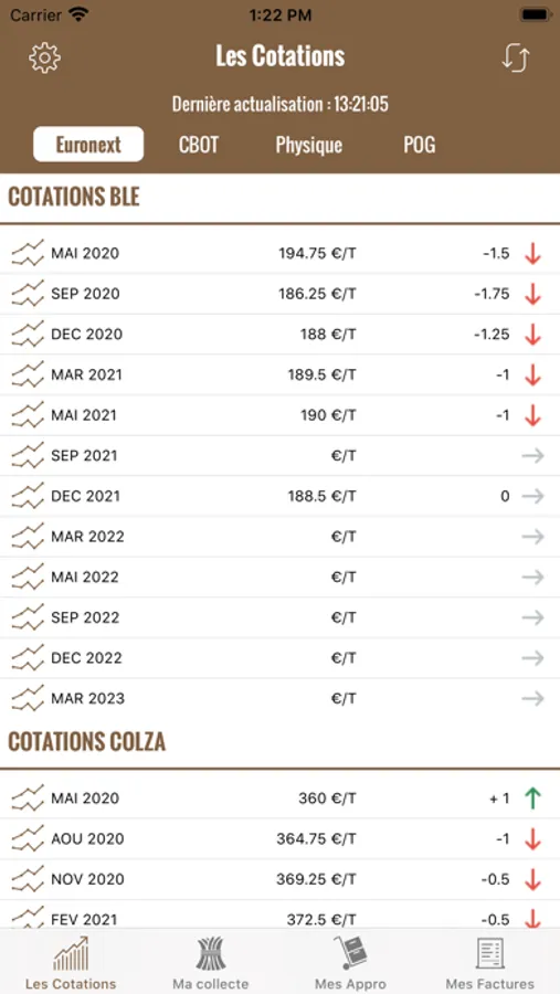 Cette application vous permet de consulter les cours Euronext en différé de 15 minutes, d’accéder aux dernières options traitées la veille, de consulter une note de marché hebdomadaire où vous y retrouverez l’essentiel du marché Euronext, Français, britannique et Mer Noire et enfin de consulter les cours physiques.