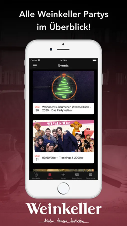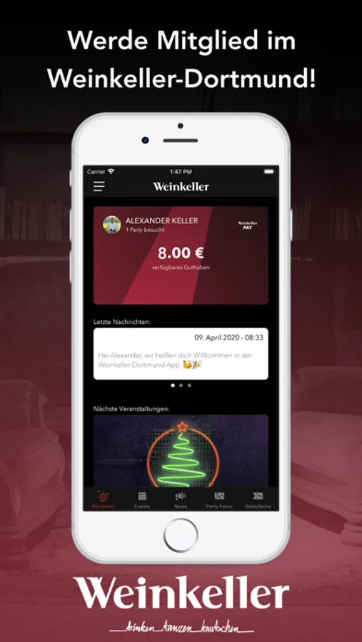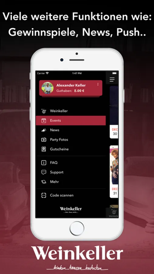 Habe unseren Veranstaltungskalender immer schnell zur Hand, Tanz durch den Stammkunden Eingang in den Weinkeller und nimm Automatisch an den monatlichen Verlosungen teil!