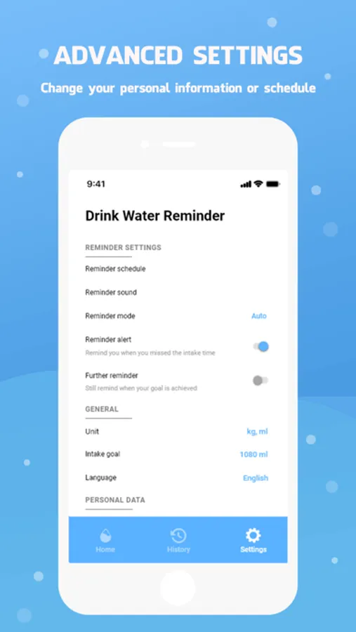 You just need to select your gender, weight, year of birth, Water drinking reminder will calculate the standard amount of water you need to consume per day.