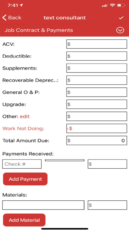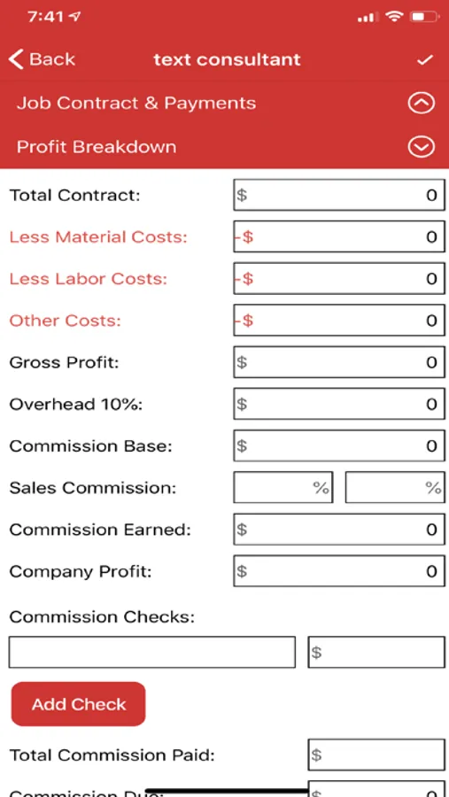 App to help construction workers document their jobs, costs, commissions, and profits.
