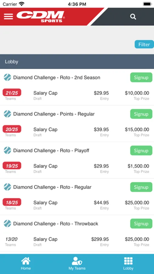 CDM Sports operates some of the industry's longest-running season-long contests in baseball, football, basketball, hockey, golf and auto racing having started in 1992. Contest offerings include Salary Cap, Pick'em, Survivor, and Draft & Play games.