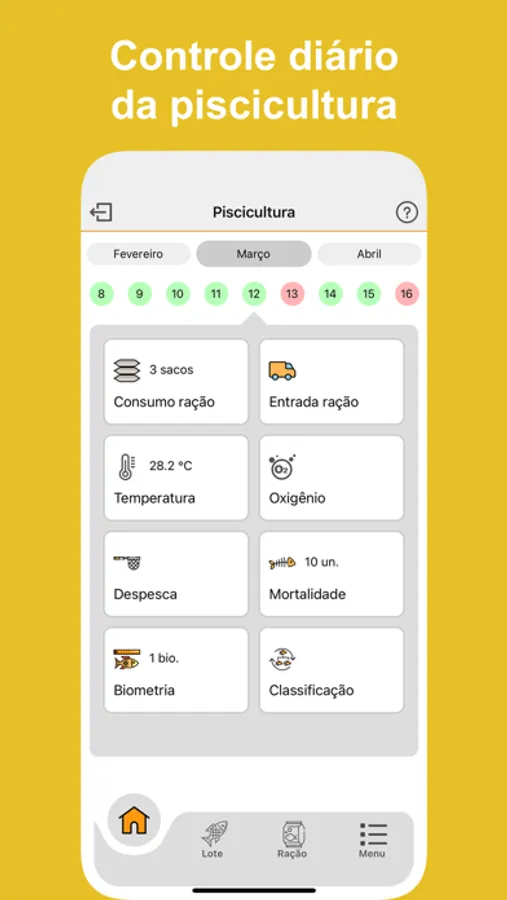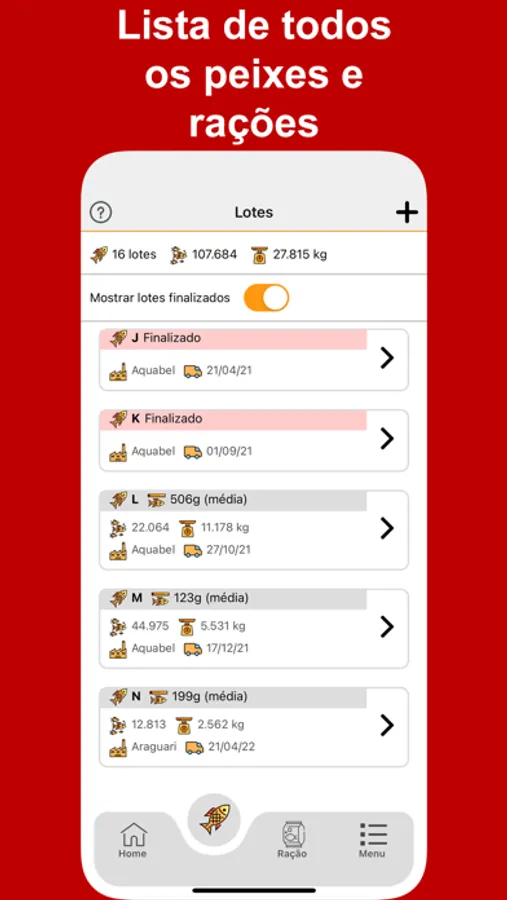 Gerencia sua piscicultura de modo fácil e completo. Adicione lotes(peixes) e rações. Associe seus funcionários à piscicultura e basta que tenham o aplicativo instalado para conseguir informar, despescas, mortalidade, mover peixes, temperatura e oxigênio da água, consumo de ração entre várIas outras funções. Além disso é possível acompanhar a evolução, desempenho, estoques e previsão de despesas através de gráficos.