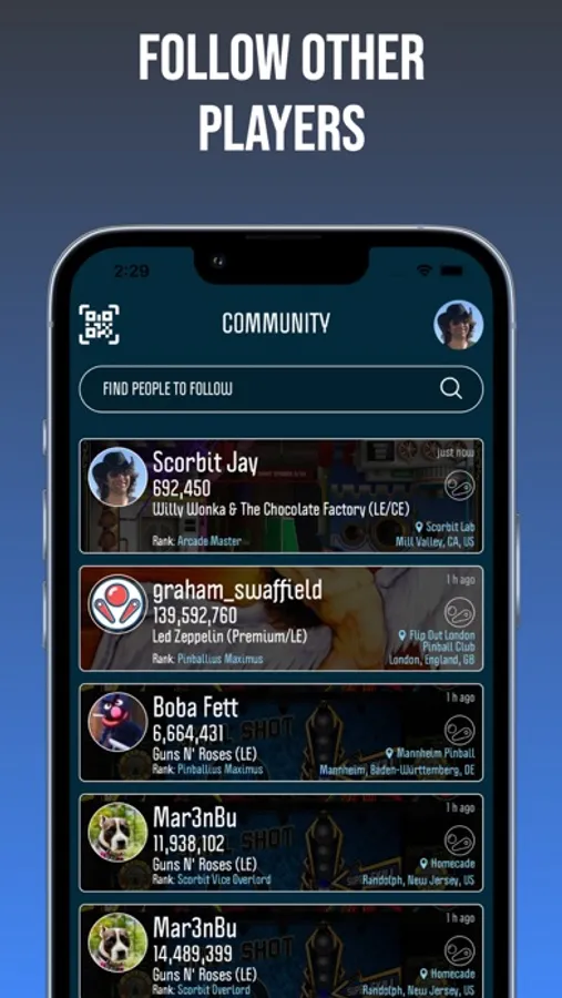 Engage with millions of players around the world. Share and stream live games and scores, earn achievements, challenge others, and participate in machine leaderboards – for any machine in any location! Follow your favorite pinball players and track what games they play and how they are playing. Streamers and collectors can use Scorbit to add real-time scores or leaderboards to their streams and game rooms for big displays! Operators can use Scorbit to monitor their machines remotely, reducing downtime, and earning more revenue.