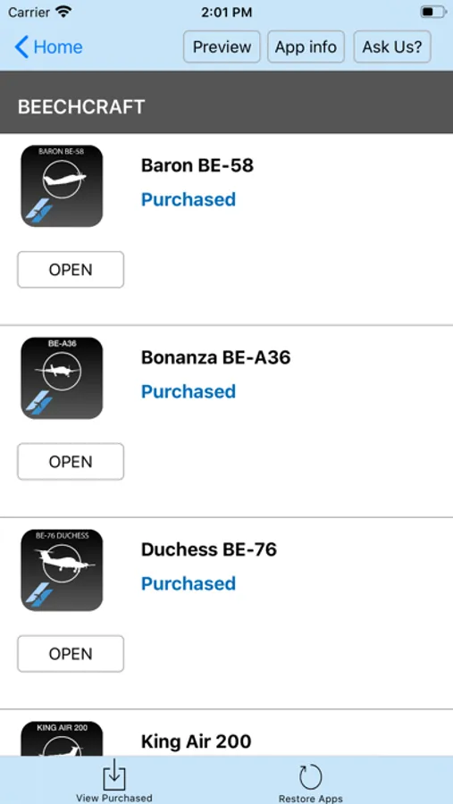 STEP 2: After AIRCRAFT APPS has downloaded to your device, tap Beechcraft Aircraft Apps on the Menu Screen and search through the in-app purchases for your aircraft.