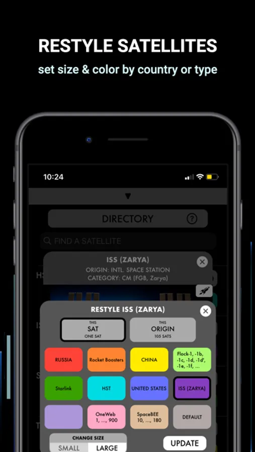 8. Restyle a satellite’s size & color by its origin, its type, or individually