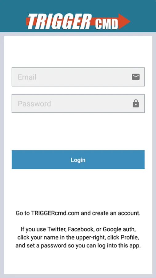 If you use social authentication (Facebook, Twitter, or Google) to create your account, you'll also need to set a password in your user profile. Click your name in the upper-right after logging in at triggercmd.com to access your profile.