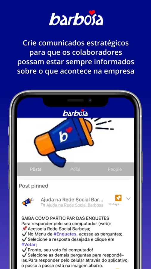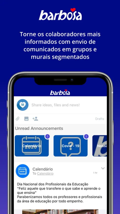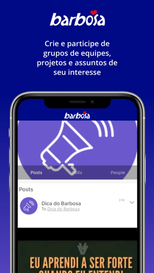 Com o aplicativo móvel Rede Social Barbosa é possível ficar por dentro de tudo o que está acontecendo na empresa mesmo não estando presente. Receba e compartilhe conteúdos com seus colegas de forma segura e simples a qualquer momento e em qualquer lugar. Facilite seu trabalho!