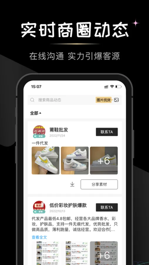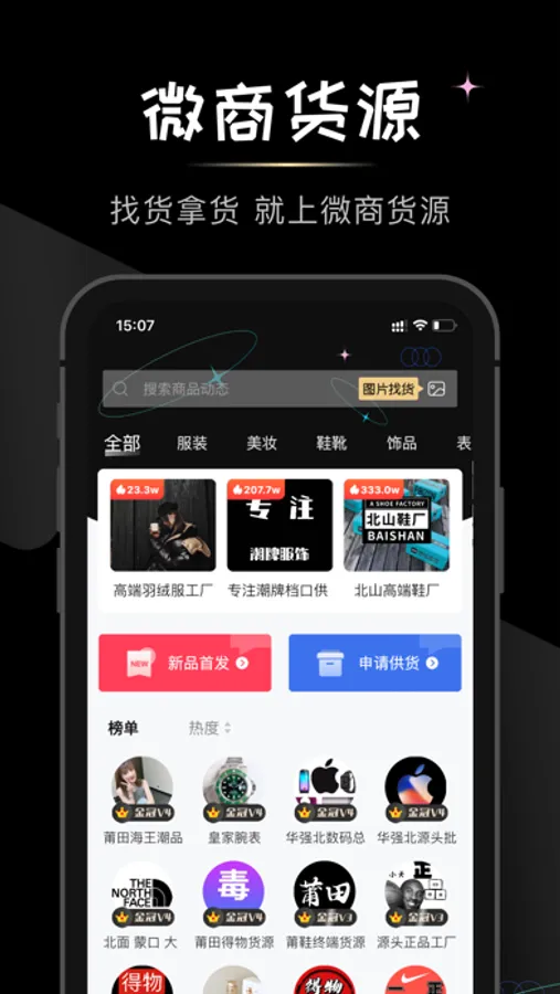 服装,美妆等各个种类货源应有尽有,实时快速更新信息,所有货源皆为一手货源,拒绝中间商赚差价,为您带来安全,实惠的进货体验。