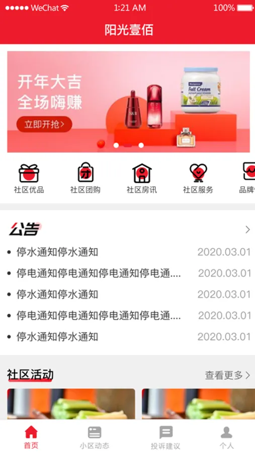 阳光壹佰APP是阳光100小区智慧社区服务平台,打通业主、物业、商户等多个重要环节,当前版本实现在线购物,社区团购,砍价助力,积分商城,自助积分等功能。