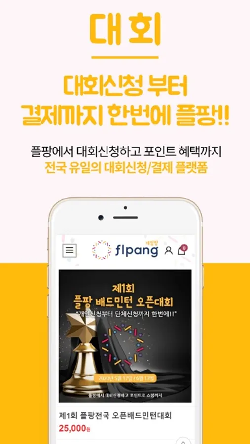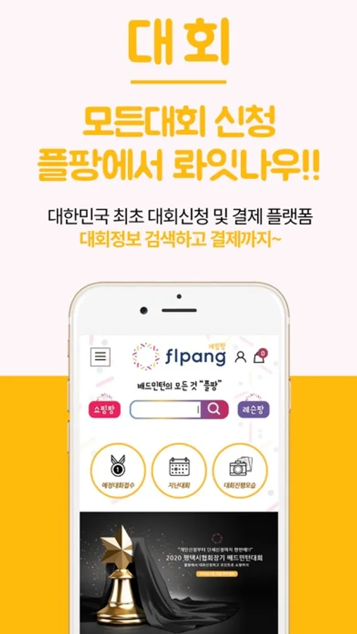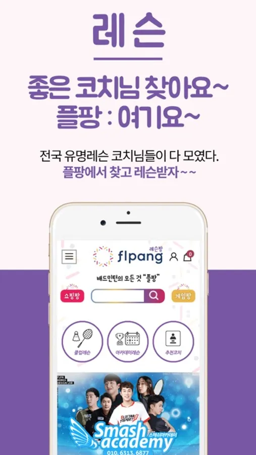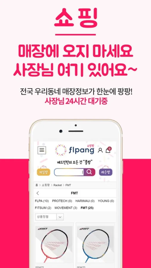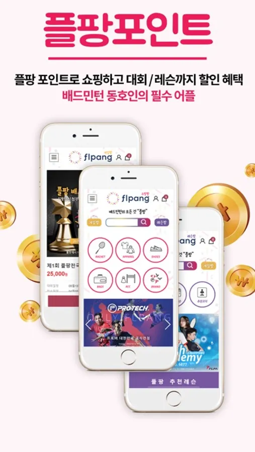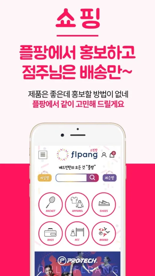 배드민턴 동호인을 위해 필요한 각종 제품과 서비스를 동시에 제공하는 전세계 최초의 통합 생활체육 플랫폼 "플팡(FLPANG)" 입니다.
