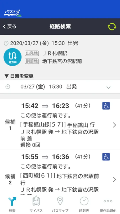 (2) 経路検索機能:バス停名、現在地の最寄り、観光施設などのランドマークからバス路線・運行状況を検索できます。