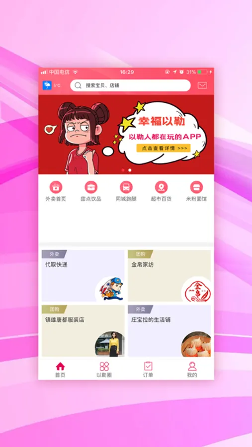 幸福外卖提供本地外卖、跑腿、团购、拼团等便民服务,有饮品汉堡、超市生鲜、日用百货、代取快递等外卖服务。有本地信息圈、房产租售、招聘求职、二手交易等本地信息服务。让您足不出户享受便捷生活,更有折扣、满减、超级会员等优惠活动。上幸福外卖,快捷便民生活服务到家。