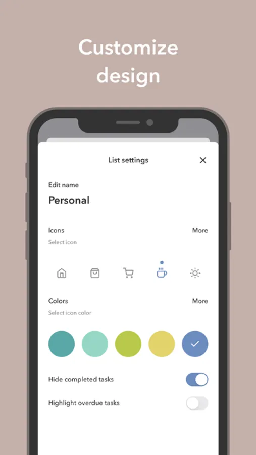 • CUSTOMIZE YOUR TASK LIST: customize icon color, icon shapes, enable / disable hiding completed tasks, and highlight overdue tasks.