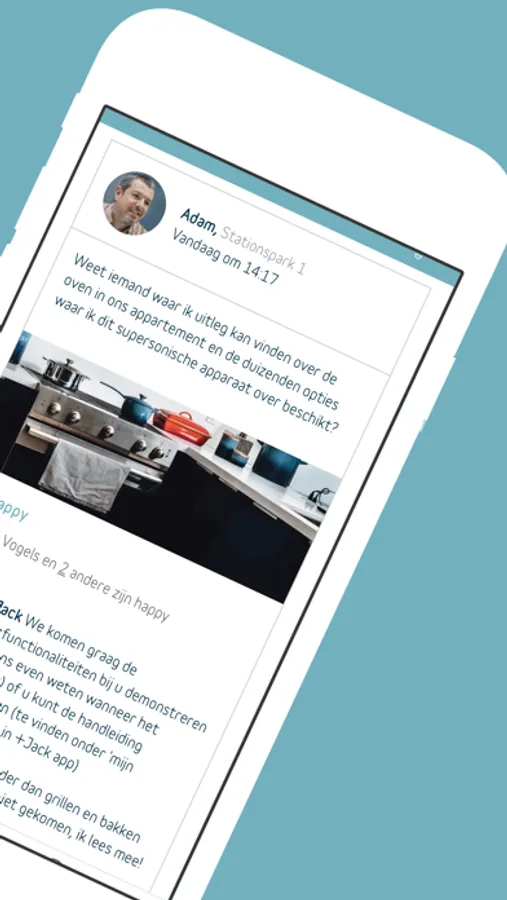 Do you live in a +Jack building? Then you can use the official +Jack app. In the app you can share messages with other residents on the timeline and contact +Jack directly. You can also read in the app the latest news about your residential building and the environment, you can use the services of +Jack and you will find up-to-date manuals about your home.