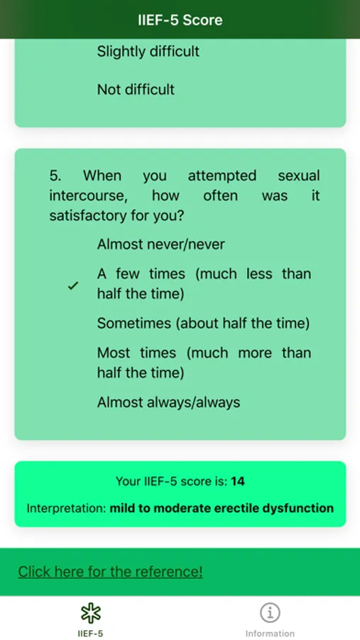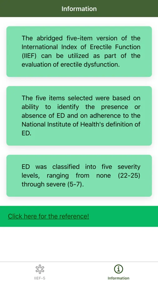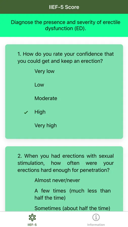 "IIEF-5 for Erectile Dysfunction - Mens Health" is a mobile app that uses the International Index of Erectile Function (IIEF-5) as a diagnostic tool for erectile dysfunction. "IIEF-5 for Erectile Dysfunction - Mens Health" app will use five questions to assess erectile function and diagnose erectile dysfunction.