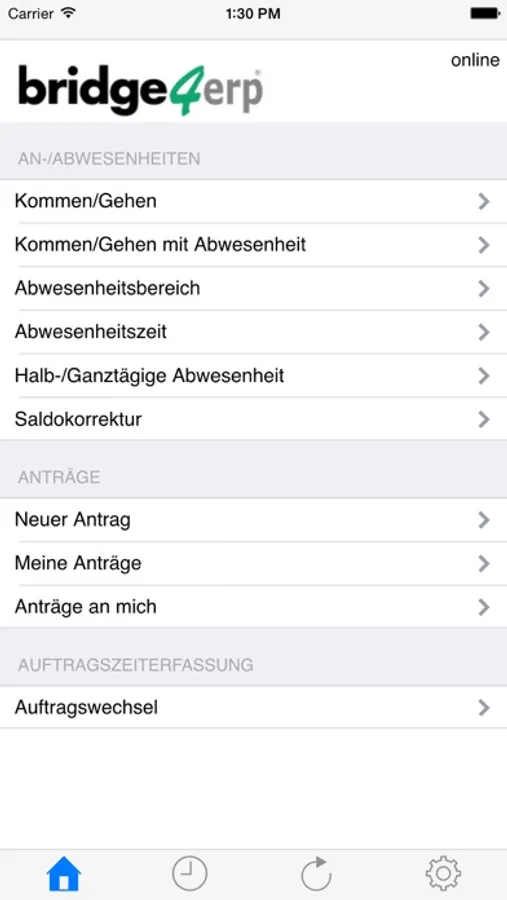 Die erfassten Buchungen werden der webbasierten Software-Lösung bridge4erp (kostenpflichtig) zur Abrechnung übergeben. Die Erfassung kann online wie auch offline erfolgen, ein manuelles Synchronisieren ist nicht nötig. Das zur Verfügung stehende Antragssystem sorgt dafür, dass Abwesenheits- und Korrekturanfragen auch von unterwegs erstellt werden können. Der bridge4erp Touch Client steht in den Sprachen Deutsch, Englisch, Französisch und Italienisch zur Verfügung.