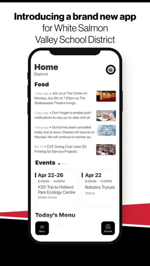 The event section shows a list of events throughout the district. Users can add an event to their calendar to share the event with friends and family with one tap.