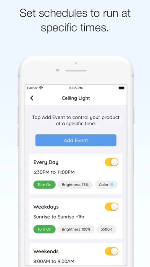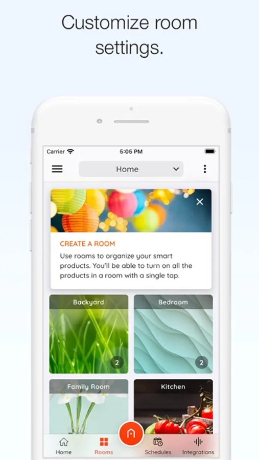 Organize your products by room and property, set schedules, or change product settings as needed using app controls. Manage and monitor your Hubspace products at home or remotely.