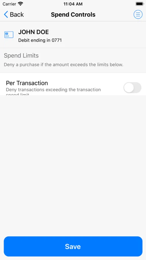 Transaction controls can be established for merchant type, dollar amount or transaction types (in-store, e-com, ATM).