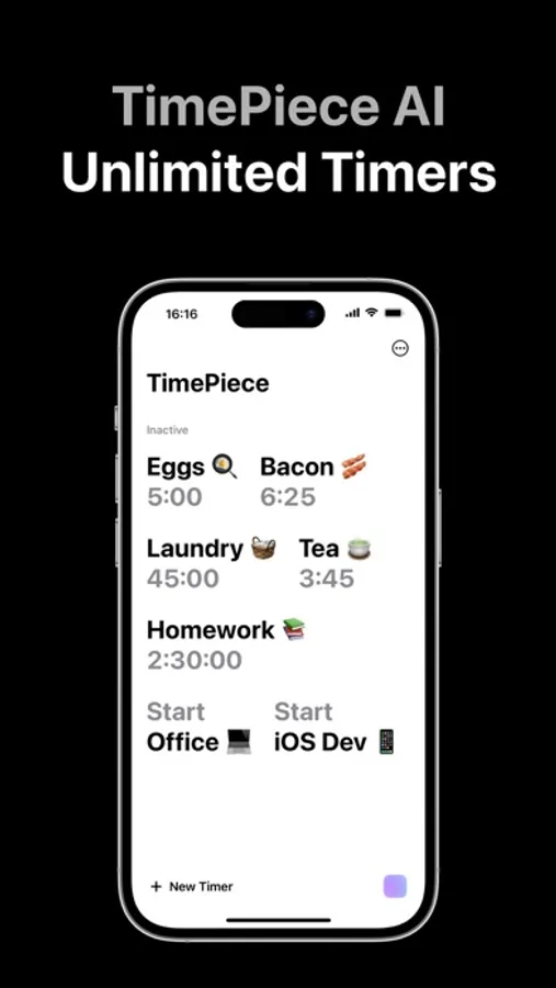Meet TimePiece — a unique timer application that provides a smart and intuitive way to manage your time. Create and run unlimited timers and stopwatches seamlessly, making it the perfect tool for your everyday timing needs.
