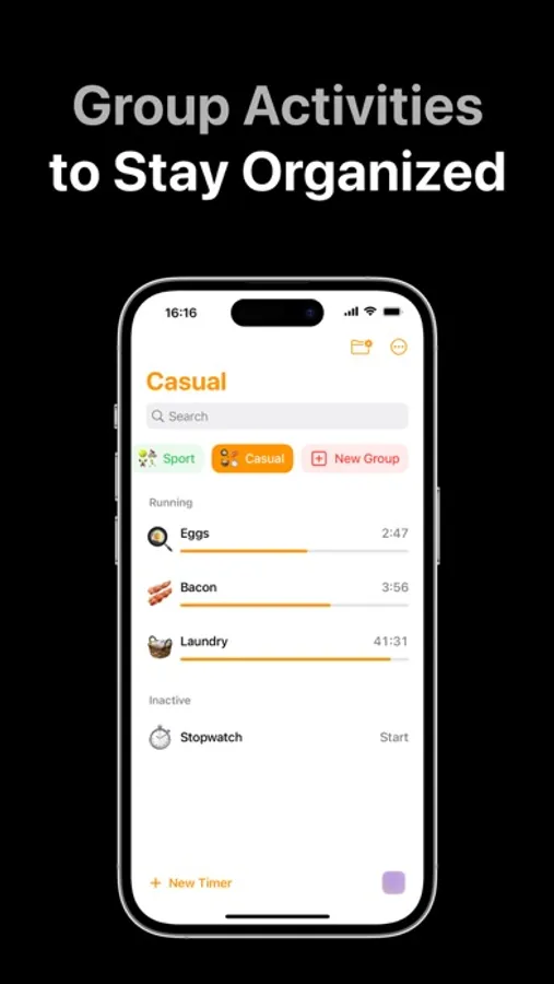 Groups: Organize your timers by theme, activity, or however you see fit. Grouping makes it simple to manage and locate your timers.