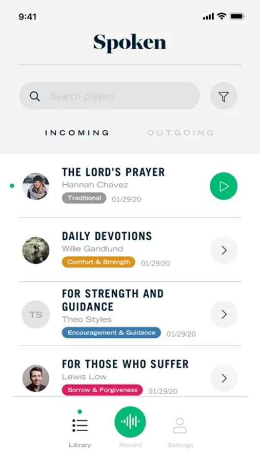 Send these personalized prayer messages back and forth, and access them any time in the app. Spoken is the voices of the people you love, reading the prayers you love, at your fingertips forever.