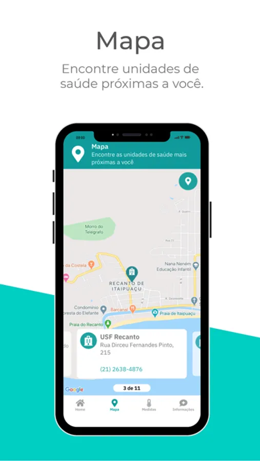- Mapa dinâmico, incluindo contato e endereço das Unidades de Saúde do Município
