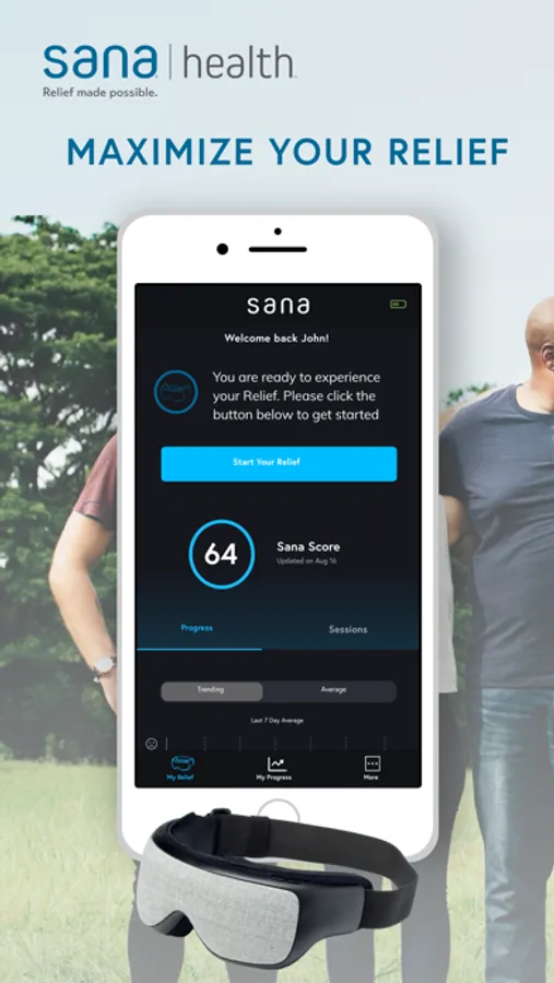 Sana is an easy-to-use wearable device that pairs with the Sana Relief App. Sana consists of a simple mask and headphones you wear on your head. The device uses audiovisual stimulation to increase balance between the left and right side of your brain, leading to greater relaxation.