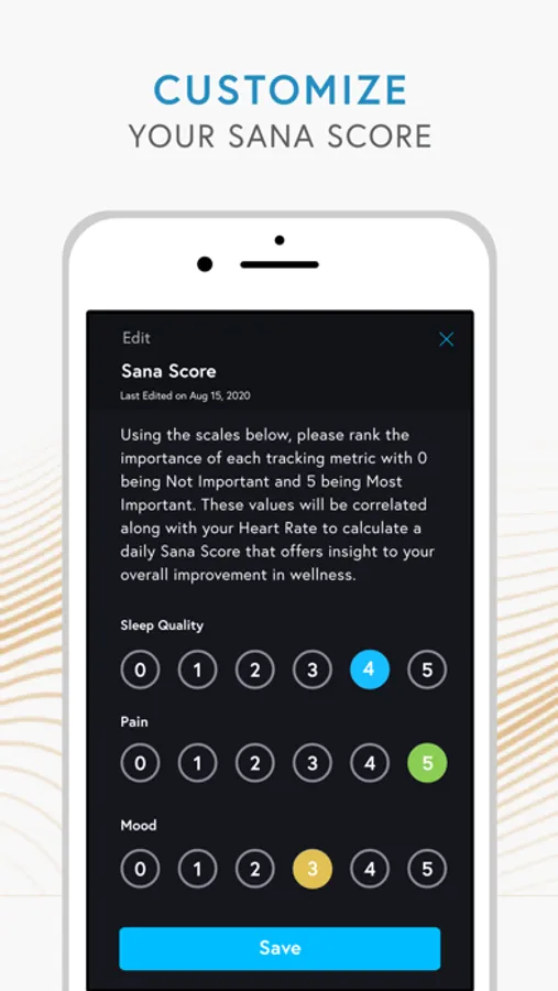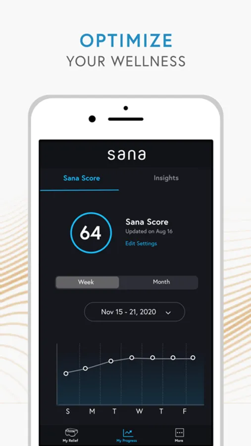 The Sana Score brings together your reported metrics of Sleep, Pain, and Mood, along with your heart rate as recorded during your Sana sessions, and calculates your daily Sana Score. To customize your experience, you can set a personalized priority on each of the metrics: Sleep, Pain, and Mood. The weight you place on each of these, along with your heart rate during each session, gives you a daily Sana Score. You’re able to view your trends via daily, weekly, or monthly views.