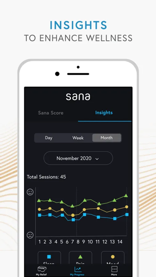 The Sana Relief App guides you through use of the Sana device. Additionally, the Sana Relief App provides a dashboard that allows you to track your daily, weekly and monthly trends on sleep quality, pain, and mood.