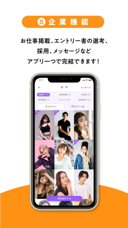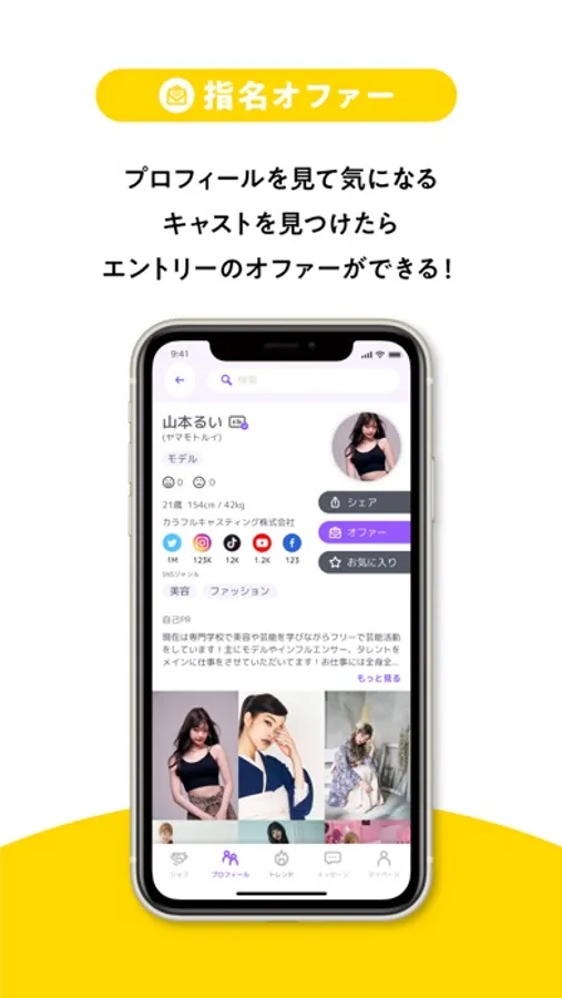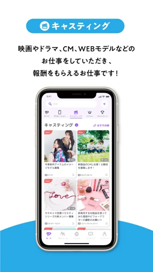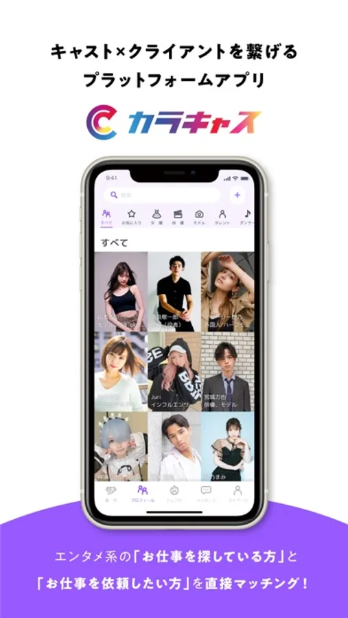 カラキャスはキャスト(インフルエンサー / モデル / 俳優 / エキストラ/歌手/アイドルなど)とクライアント(企業)をつなげるマッチングプラットファームアプリです。