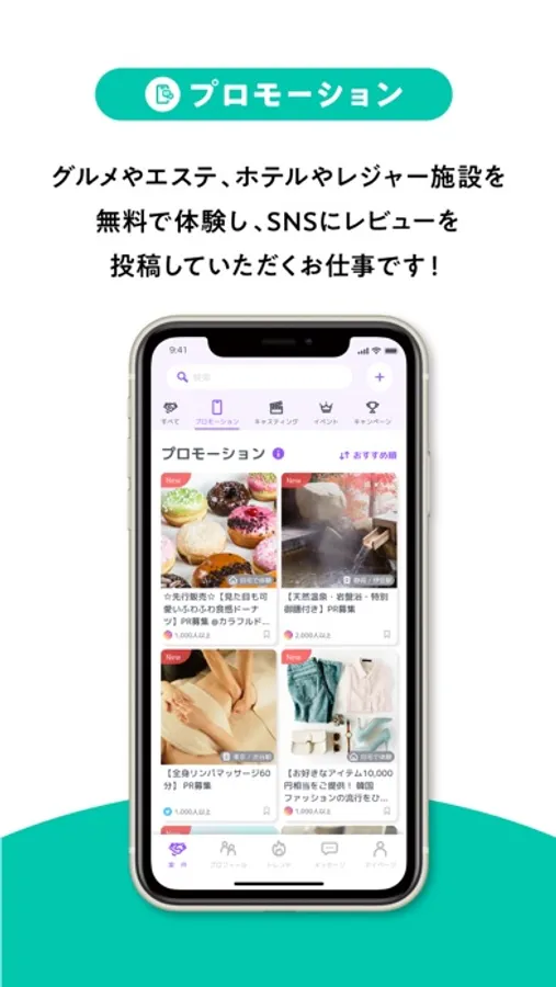 グルメやエステ、ホテルやレジャー施設を無料で体験し、SNSにレビューを投稿していただくお仕事です。報酬ありのお仕事もあります。