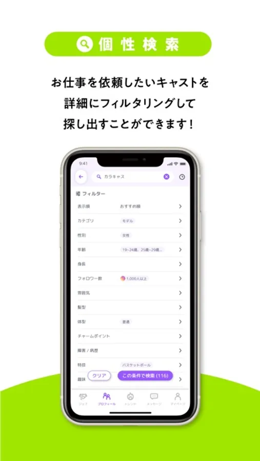 キャストは自分に合ったお仕事、クライアントはお仕事を依頼したいキャストを詳細にフィルタリングして探すことができます。
