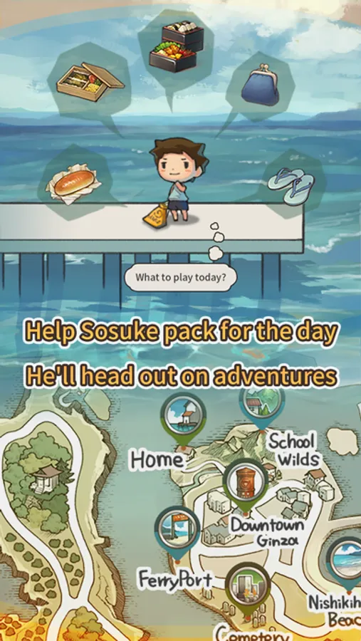Just pick a few items for our protagonist Sosuke to put in his backpack for the day, and off he'll go to explore. When he returns, he'll regale you with tales of his adventures. From bug-hunting to beaches to friends to family—many stories both sad and sweet await you.